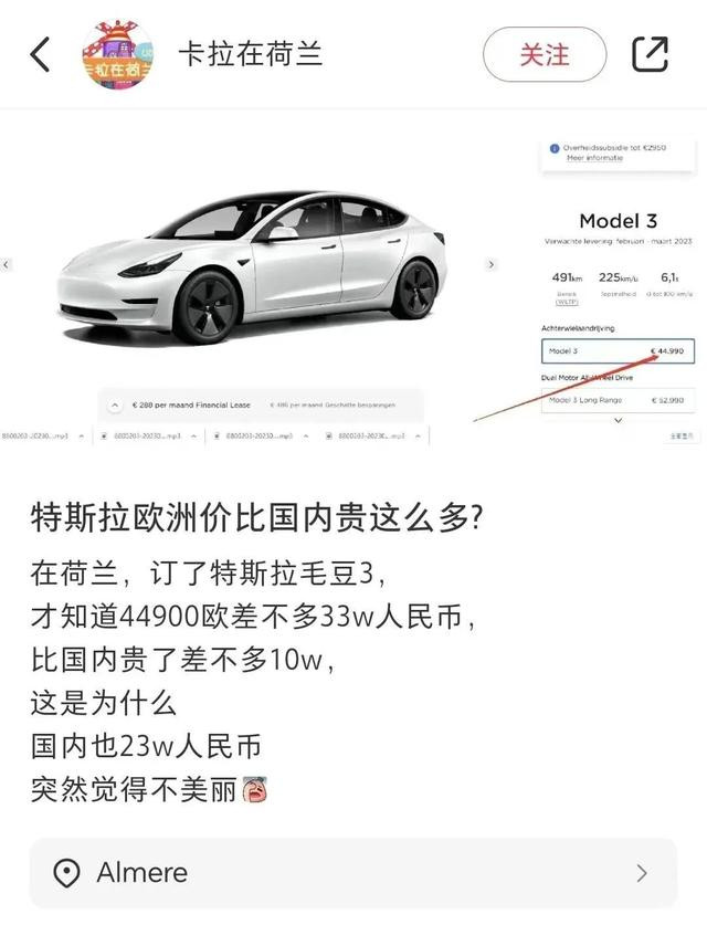 不少国外网友在对比脱手价钱后发现,中国事特斯拉公共售价最低的市集之一,国内恣虐者享受脱手Model 3最实惠的价钱。国外博主“卡拉在荷兰”在荷兰订购特斯拉Model 3后发现,价钱比国内向上了近10万元,直呼珍惜国内车主!