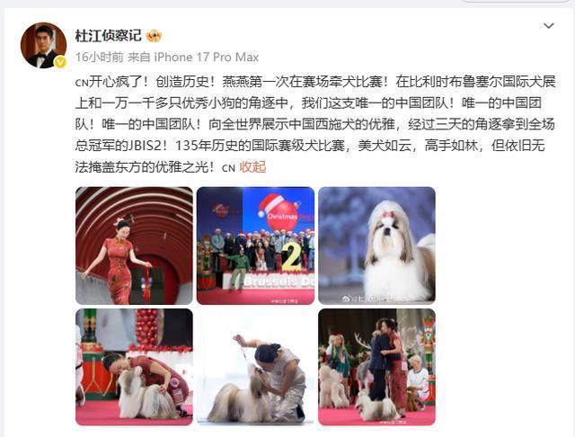 霍想燕丈夫杜江随后也发文:兴隆疯了!创造历史!燕燕第一次在赛场牵犬比赛!在比利时布鲁塞尔海外犬展上和一万一千多只优秀小狗的角逐中, 咱们这支唯独的中国团队!唯独的中国团队!唯独的中国团队! 向全宇宙展示中国西施犬的优雅,历程三天的角逐拿到全场总冠军的JBIS2!135年历史的海外赛级犬比赛,好意思犬如云,妙手如林,但依旧无法诡秘东方的优雅之光!