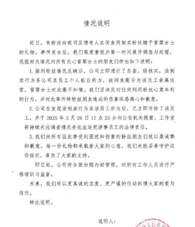 粉丝相配伤心,但愿曾黎方讲解注解显然。辛勤经东谈主到中年,资格过诸多事宜的曾黎竟然条目粉丝给她谈歉,因为售卖礼物的是职责室东谈主员,我方并不知情,但是粉丝把这件事晒到网上,让我方名誉受损,是以条目粉丝谈歉。