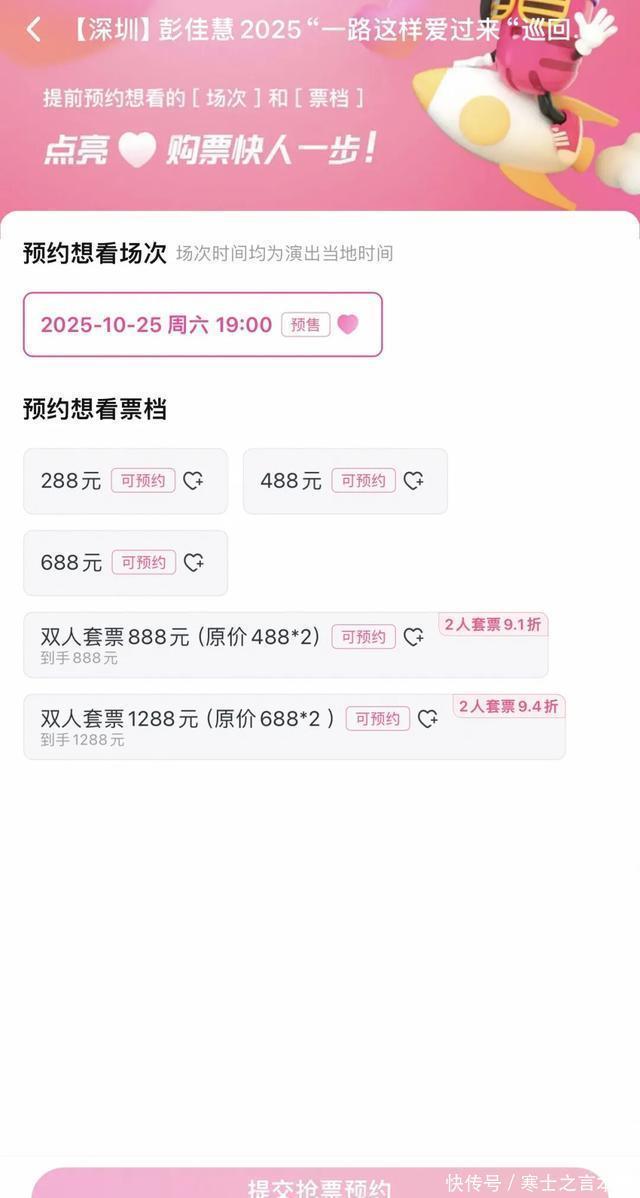 这次演唱会建树288元、488元、688元以及双东谈主套票888元、双东谈主套票1288元票价,温情不同群体需求,9月8日17:00,该演唱会将在“大麦”“猫眼”等平台认真开票。
