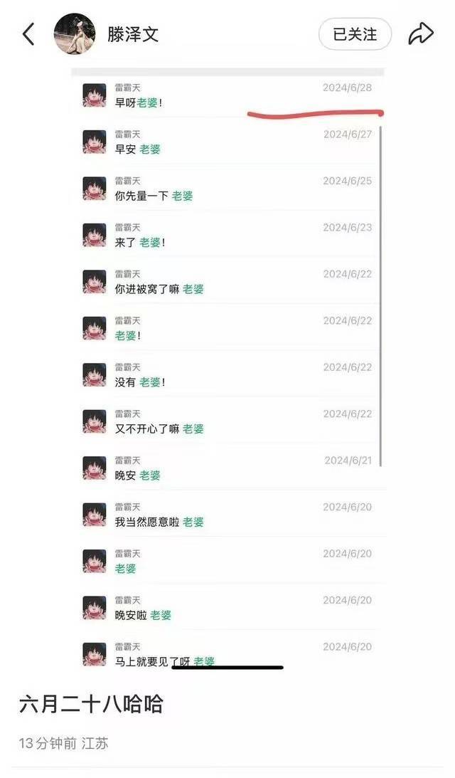 好像是思坐实“嫂子”身份,滕泽文片面晒出了和田栩宁的聊天记载,其中不乏田栩宁称号她为“爱妻”的字样。