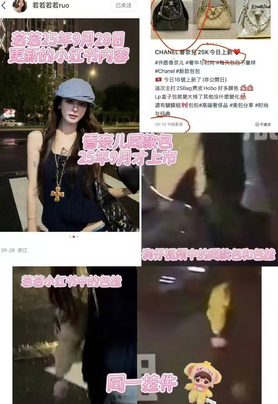 其一,她示意该视频的拍摄手艺是9月15日,其二,视频中若若所背的包包是九月新款,以致她还曾在小某书上高调发图炫夸过,就连包包上的潮玩配饰也与她9月28日晒照所示的一致。