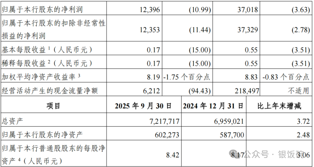 2025年三季报透露,该行完了商业收入942.70亿元,同比下落7.94%;净利润372.78亿元,同比下落3.40%;归母净利润370.18亿元,同比下落3.63%。从收入结构看,利息净收入688.81亿元,同比下落5.11%;而手续费及佣金净收入达到155.02亿元,同比增长2.18%,这一阐明成为三季报最大亮点,到手由上半年的下落0.9%转为正增长。