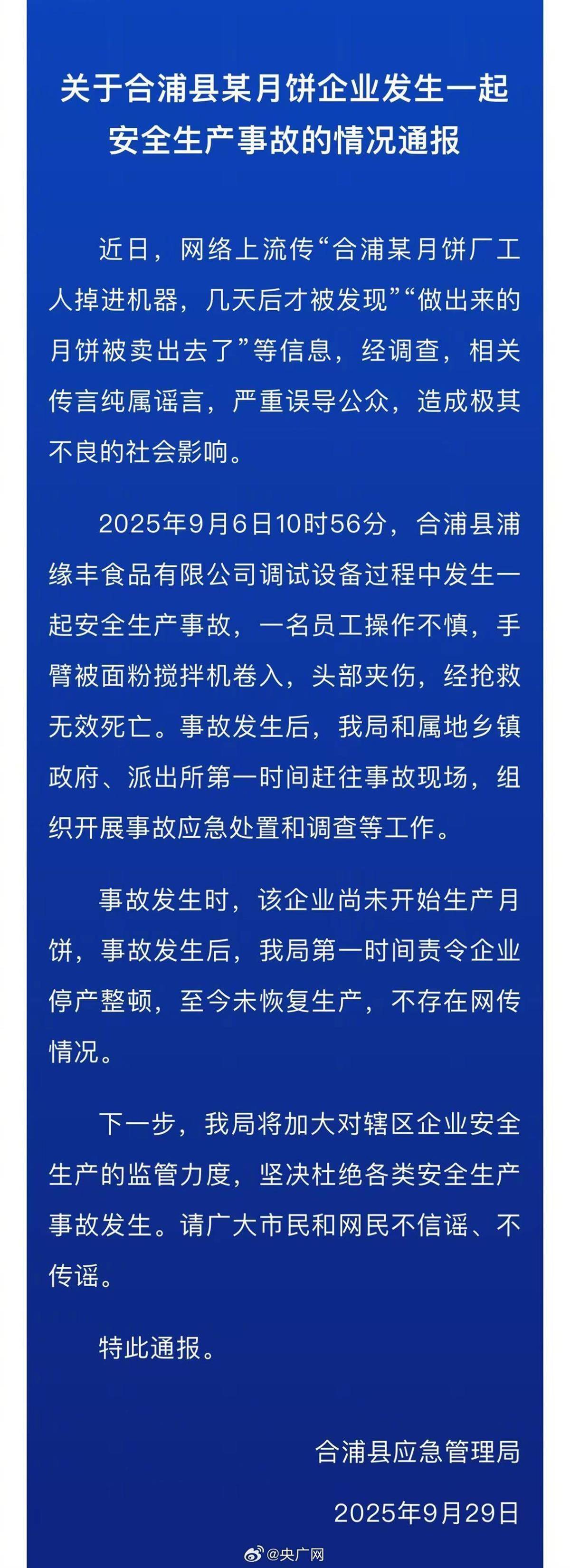 9月29日,合浦县救急管制局发布情况通报:2025年9月6日10时56分,合浦县浦缘丰食物有限公司在调试开采过程中发生沿路安全出产事故,别称职工操作失慎,手臂被面粉搅动机卷入,头部被夹伤,经抢救无效死字。事故发生时,该企业尚未运转出产月饼,事故发生后,我局第一时分责令企业停产整顿,于今未归附出产,不存在网传情况。